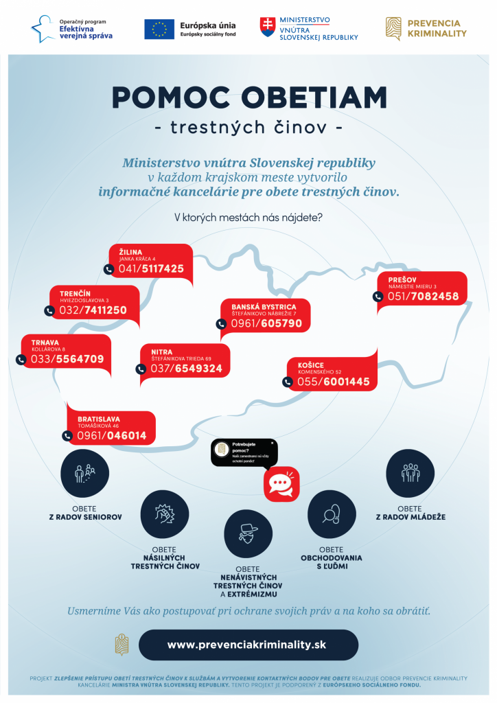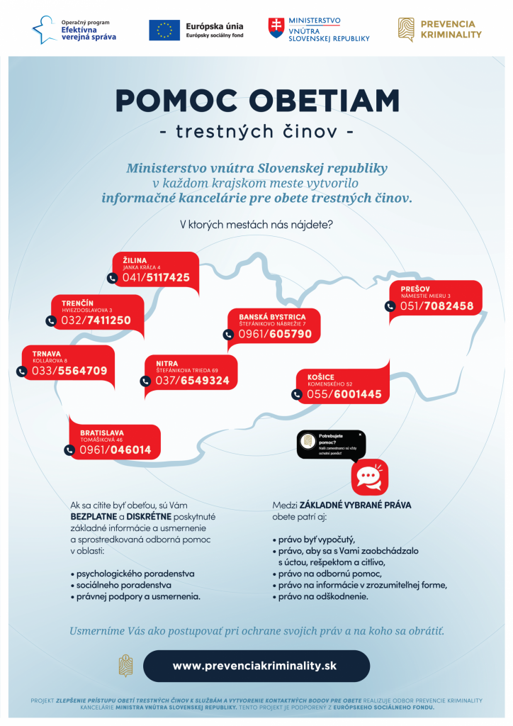 V TT kraji sídli informačná kancelária na ulici Kollárova 8, Trnava - kontakt na čísle 033/55 64 709, e-mailom na webovej adrese pomocobetiam@minv.sk, poštou, osobne, facebook Prevencia kriminality alebo bezplatne konzultácia cez on-line chatovej poradne na: https://prevenciakriminility.sk/