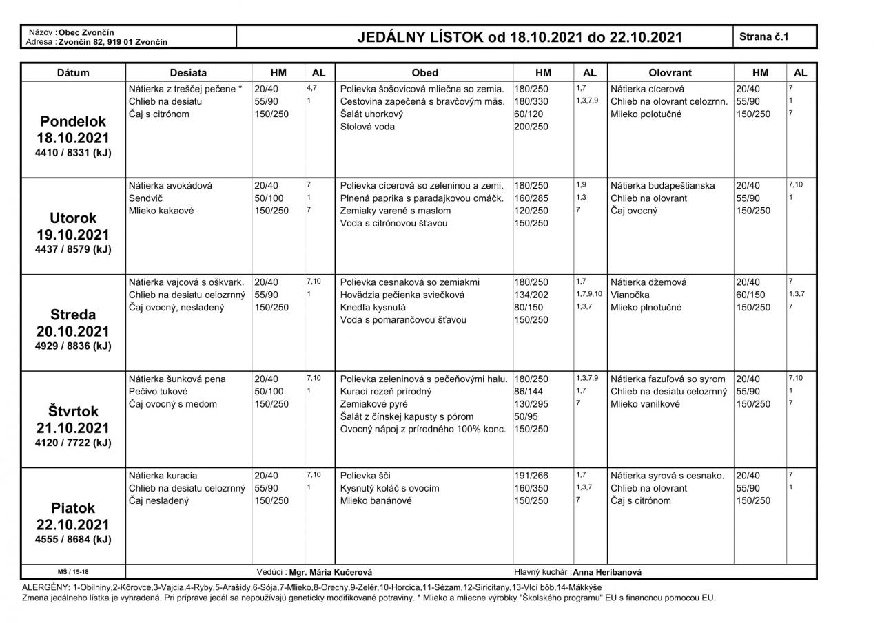 Jedálny lístok MŠ Zvončín 42. týždeň