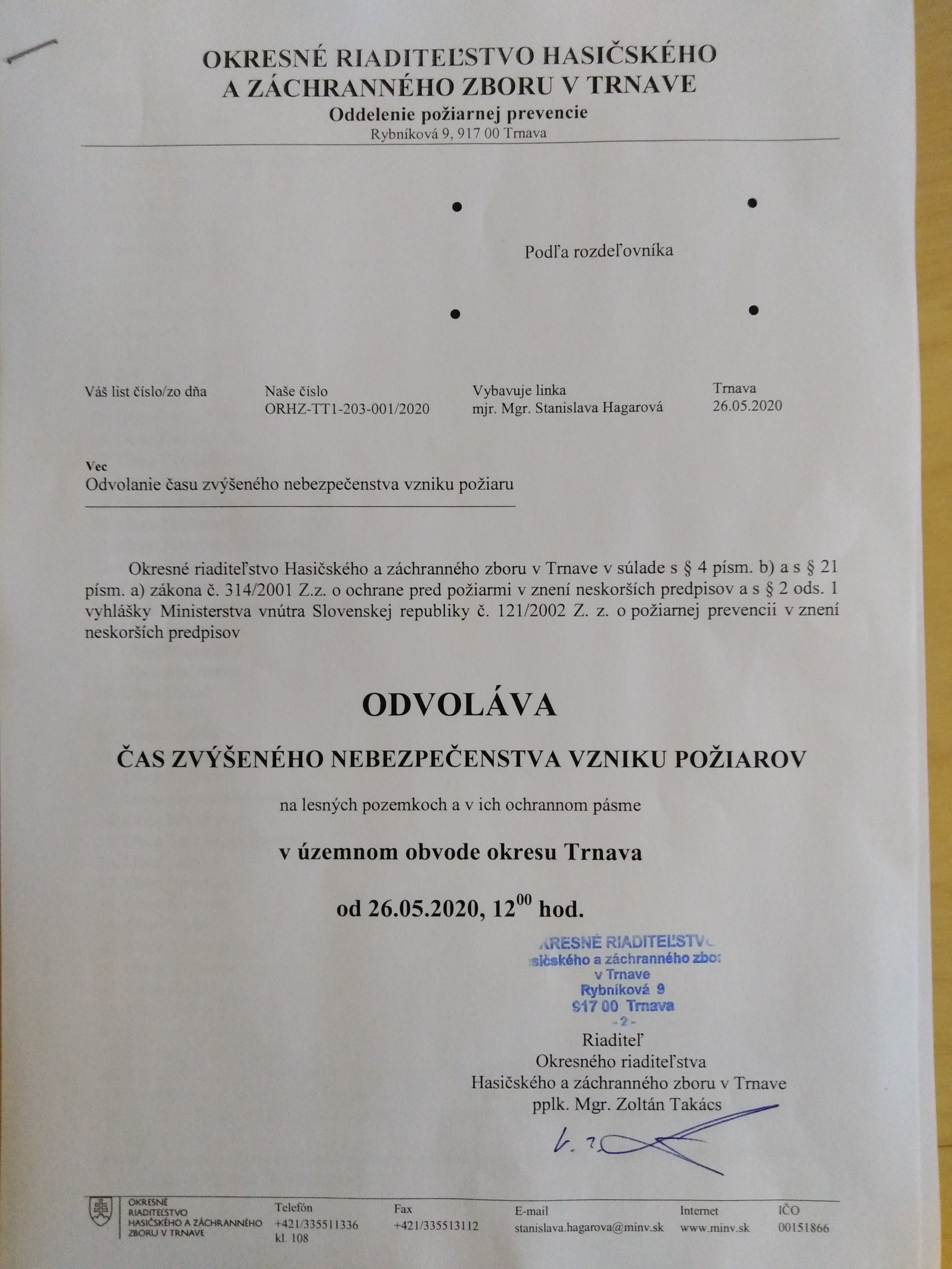 Okresné riaditeľstvo hasičkého a záhranného zboru v Trnave odvoláva čas zvýšeného vzniku požiarov odo dňa 26.05.2020 od 12:00 hod.