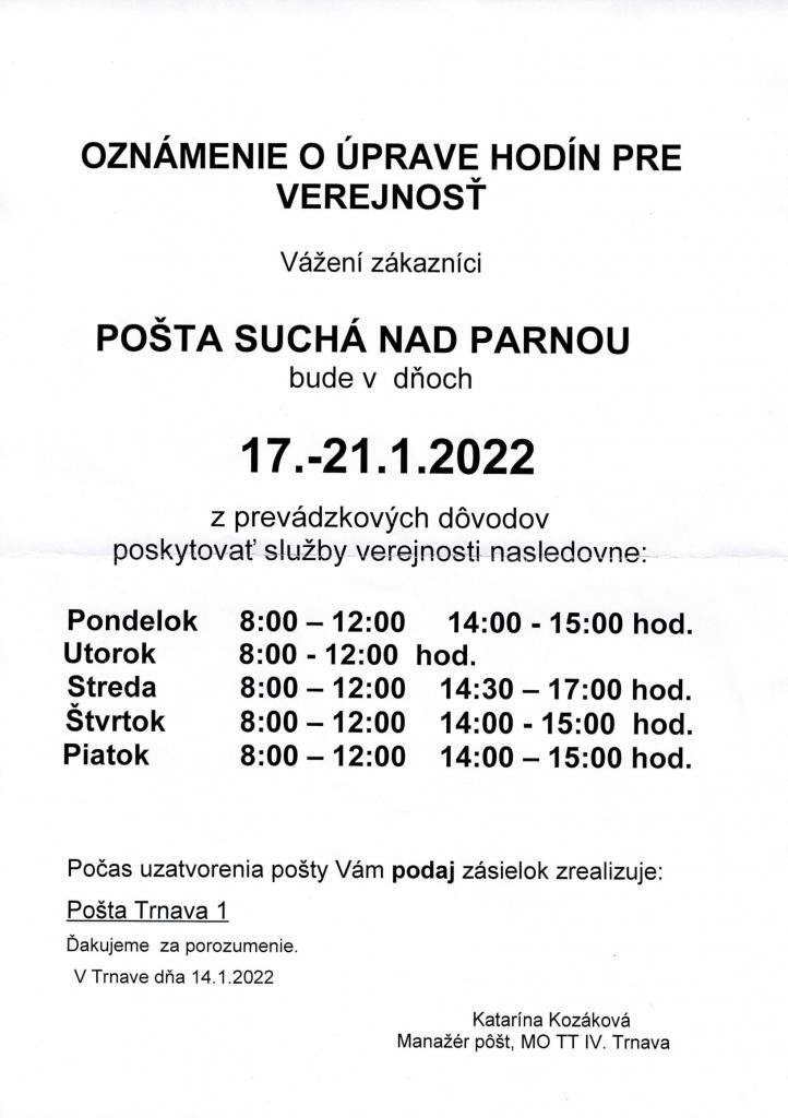 Oznámenie o úprave hodín pre verejnosť - pošta Suchá n/P