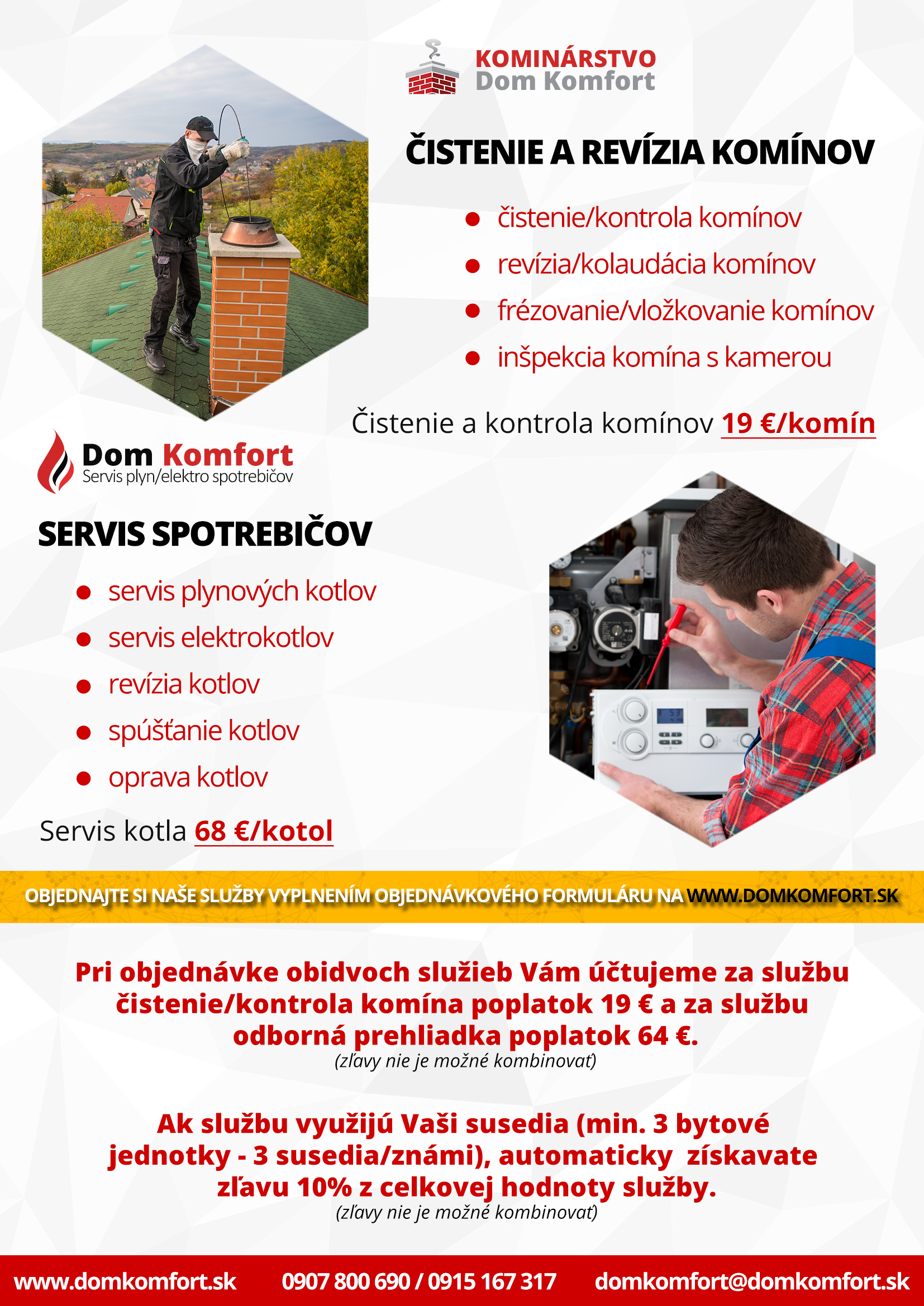 Kominárstvo Dom Komfort ponúka v obci dňa 18.08.2020 ročnú revíziu komínov a odborný servis plynových kotlov. V prípade záujmu o ponúkané služby môžete firmu kontaktovať do 17.08.2020 na telefónnom čísle: 0907 800 690, 0915 167 317 alebo cez www.domkomfort.sk