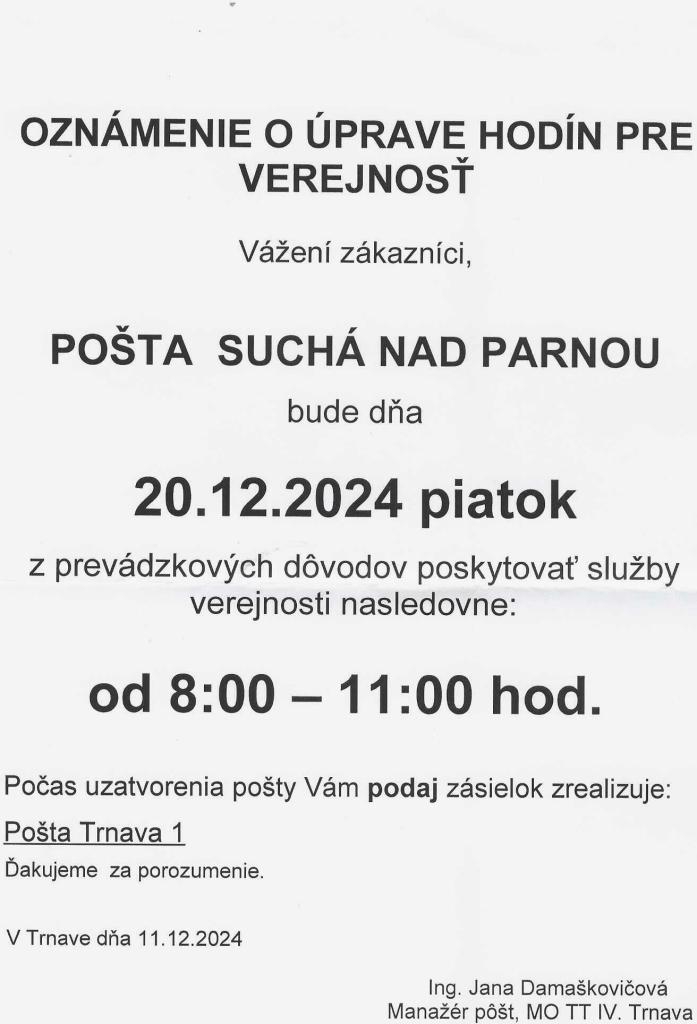 Pošta Suchá nad Parnou - úprava hodín pre verejnosť dňa 20.12.2024