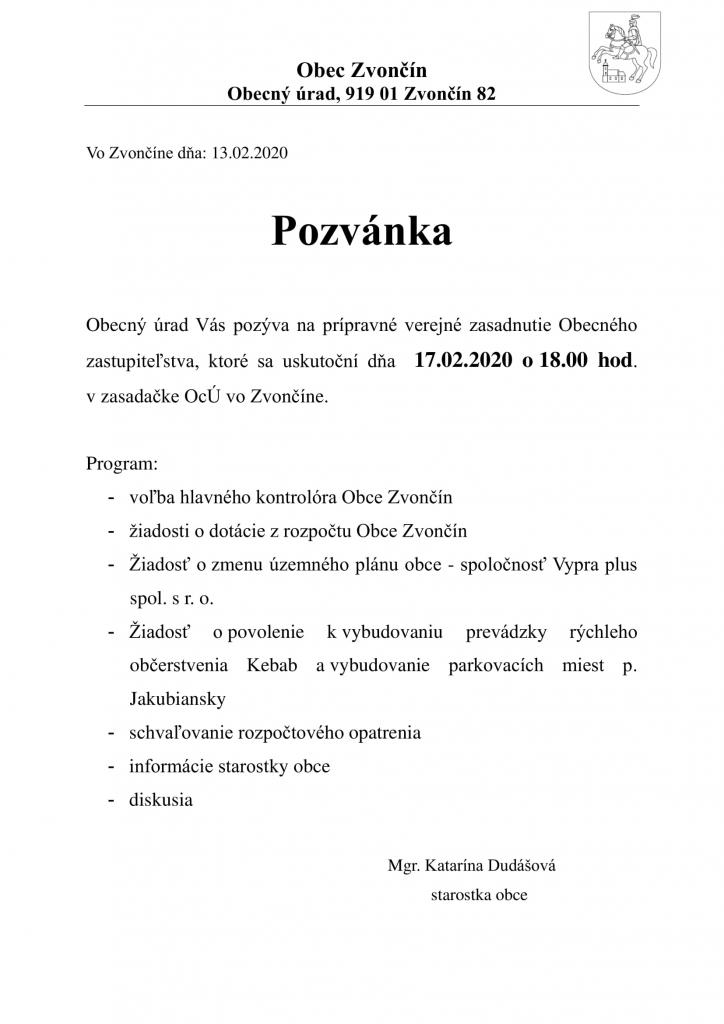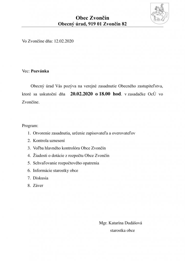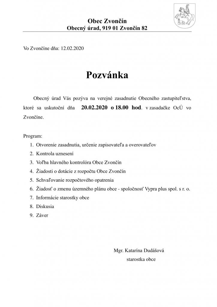 Pozvánka na verejné zasadnutie obecného zastupiteľstva obce Zvončín dňa 20.02.2020