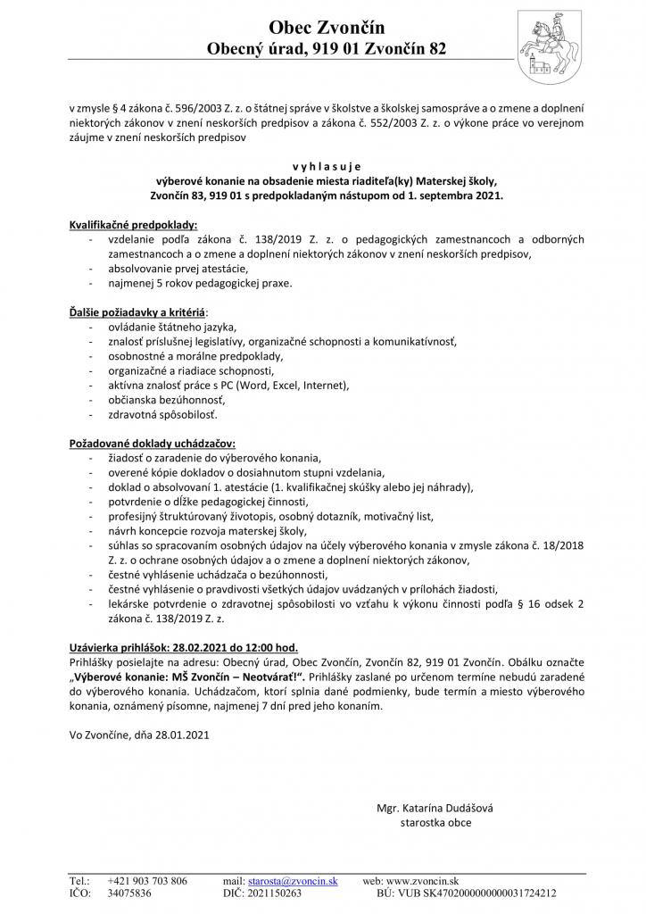 Výberové konanie na riaditeľa MŠ Zvončín od 09/2021