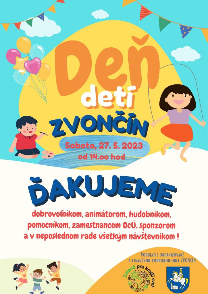 Ďakujeme všetkým dobrovoľníkom, animátorom, hudobníkom, pomocníkom, zamestnancom OcÚ Zvončín a sponzorom ktorí nám pomohli toto podujatie pre deti pripraviť.